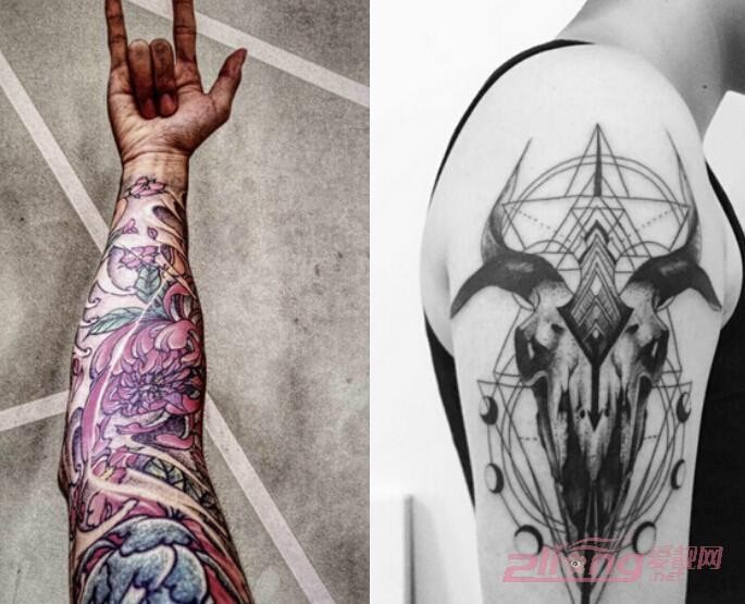 男生纹身款03and04:色彩斑斓的纹身图案总是男生花臂的最佳款,全是自然的花朵描绘让男生整个形象都充斥着酷炫的欧美大牌感,随性又随心。暗黑系列的男生纹身款也是如此地霸气自信,简单的几何图案搭配着鬼魅的羊头造型,给人一种利索的个性感,十分地百搭。