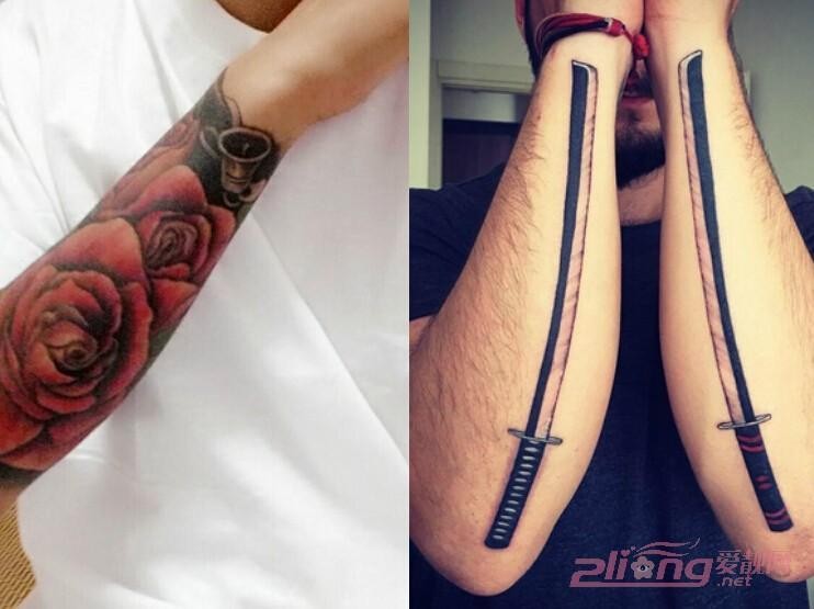 男生纹身款07and08:不得不说,男生手臂处的玫瑰花纹身图案实在是太有气质了!鲜红的色料勾画出来的花朵惟妙惟肖,暗黑的图案加以配搭,让整个男生纹身都充斥着酷炫感。双臂中都各纹有一把斧刀的纹身图案十分特别,不同款式都勾画都能带出同样的自信与利落感,超man的!