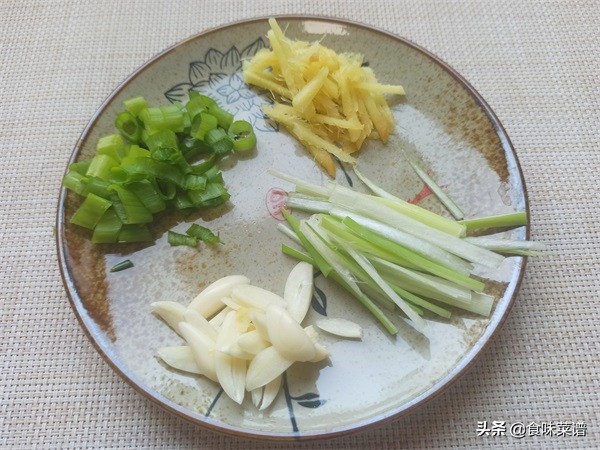 2、准备适量的辅料,大葱切成细丝,大蒜切成薄片,生姜切成细丝,再切一把葱花,装入盘中备用。
