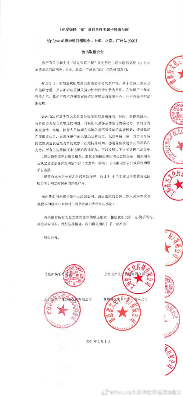 2月1日,刘德华巡回演唱会官方微博发布通告称,由于新型冠状病毒肺炎的疫情仍然严峻,基于公共卫生安全及健康考量,上海、北京、广州三站演唱会的主办方决定取消演唱会,详情请关注后续公告。
