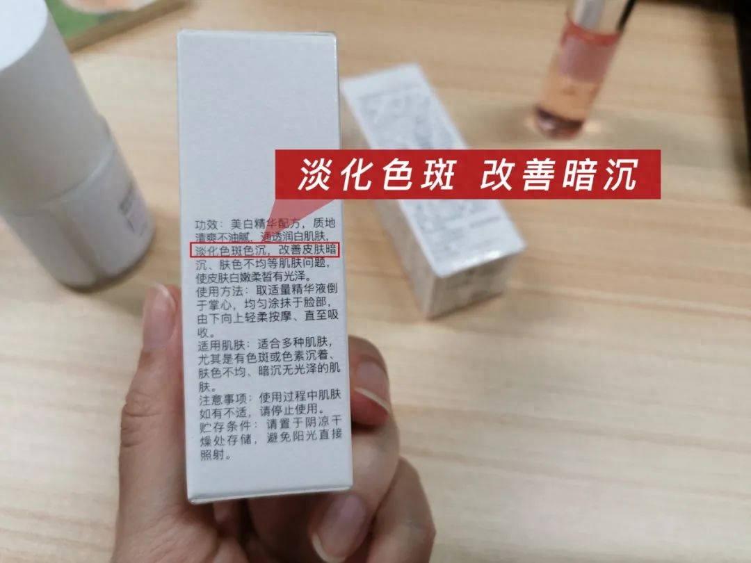 打开盒子仔细看了看,产品说明书上,确实有“淡化色斑、暗沉、使皮肤白嫩”的字样。
