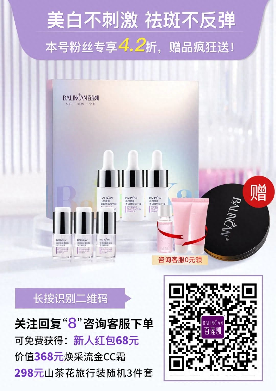 ①48小时抢购,立减68元②下单即赠,价值368元气垫CC霜③咨询客服,0元领价值298元山茶花旅行随机3件套