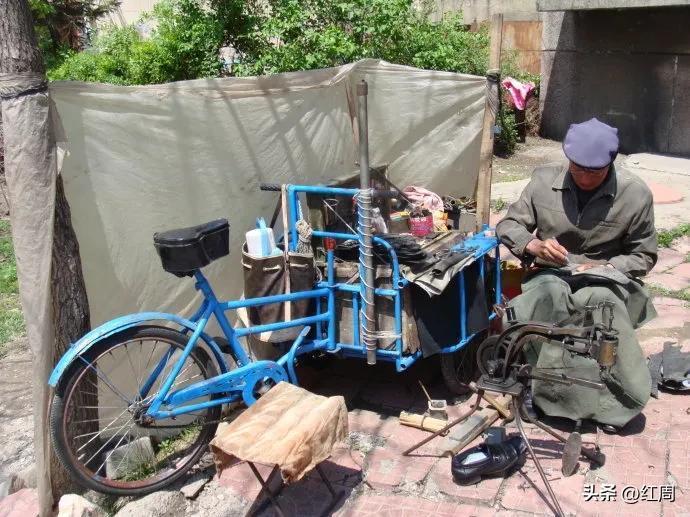 当下的鞋匠,早就不用扁担挑木箱了,而是把所有的东西用三轮车来装。