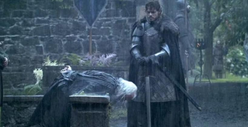 罗柏以叛国罪处决了瑞卡德·卡史塔克,亲手砍下了他的头颅。