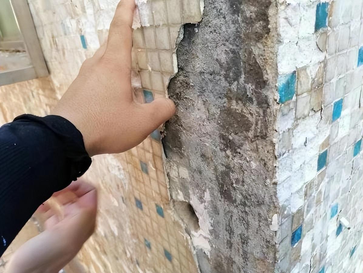 图3 马赛克墙砖空鼓 图4 瓷砖掉落后,墙面渗漏