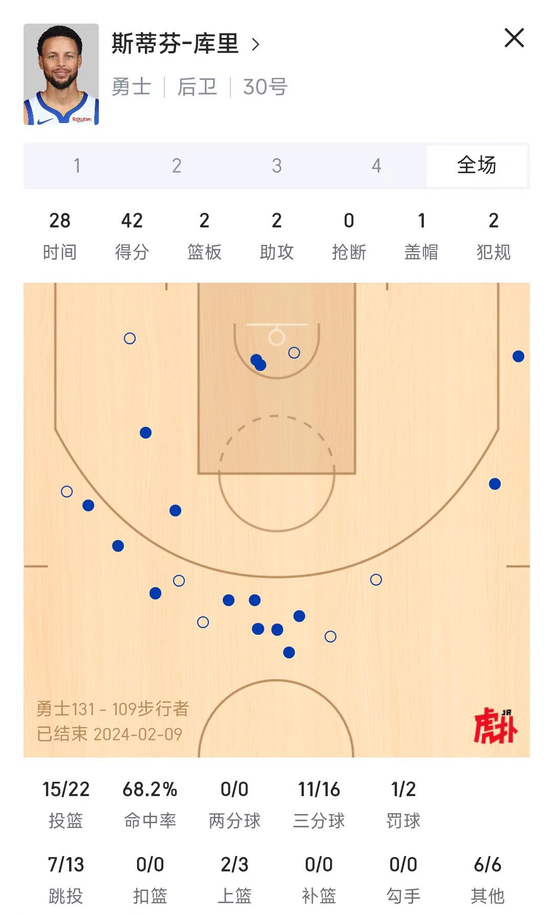 >>赛后库里数据:22投15中 拿到42分2板2助!另有1帽0断2误2犯+11记三分