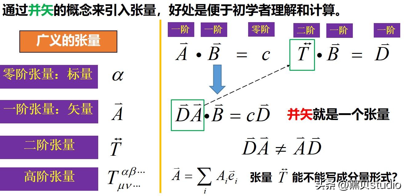 总之,张量是一种由多个并矢组成的量,它可以用多个箭头来表示。并矢是一种由多个向量组成的量,它可以用两个或多个箭头来表示。向量是一种具有大小和方向的量,它可以用一个箭头来表示。通过并矢的概念,我们可以从简单到复杂,逐步理解张量的本质和特点。张量是一种强大而灵活的工具,它可以帮助我们探索和创造更多的知识和价值。