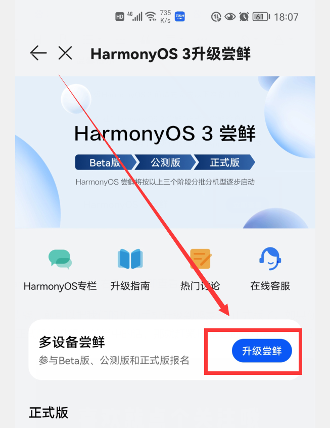 然后点击“升级尝鲜”按钮。