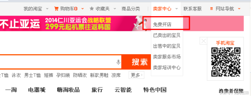 ①未绑定支付宝账户,请在支付宝账户注册激活后,登户陆您已注册并激活的淘宝账号,点击淘宝网首页导航条右上方的“卖家中心”或直接点击“免费开店”,如下图: