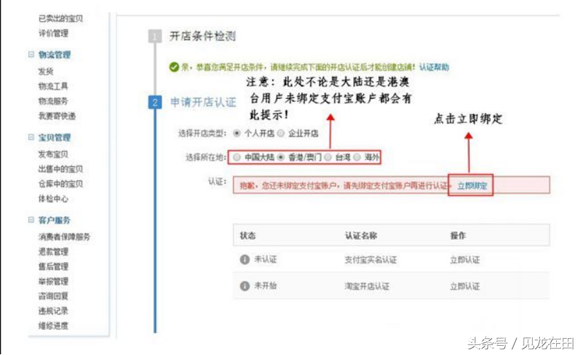 ③如您是在首页直接点击了“免费开店”,进入申请页面后系统首先会检测您是否满足开店条件,如您满足条件,则可继续申请,选择您开店的类型,如您是个人用户开店(指非公司性质的开店用户),在您淘宝账户未绑定淘宝账户时,系统会提示您去绑定支付宝账户,如下图所示,您需点击“立即绑定“;