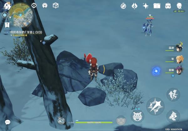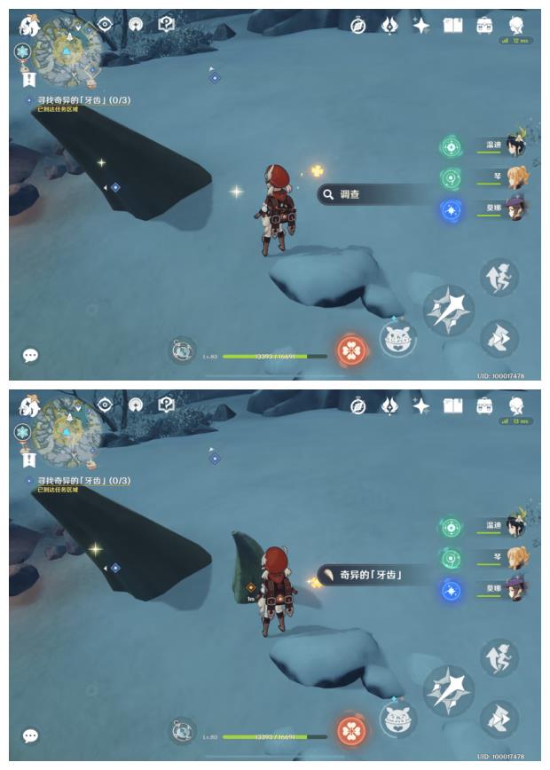 1. 在「龙脊雪山」地区4处点位中的任意位置找到【奇异的「牙齿」】,与其交互后获得相关道具【奇异的「牙齿」】