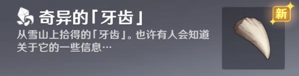 在「龙脊雪山」地区中探索,拾取道具【奇异的「牙齿」】,获得【奇异的「牙齿」】后,将解锁世界任务「腐殖之牙」。