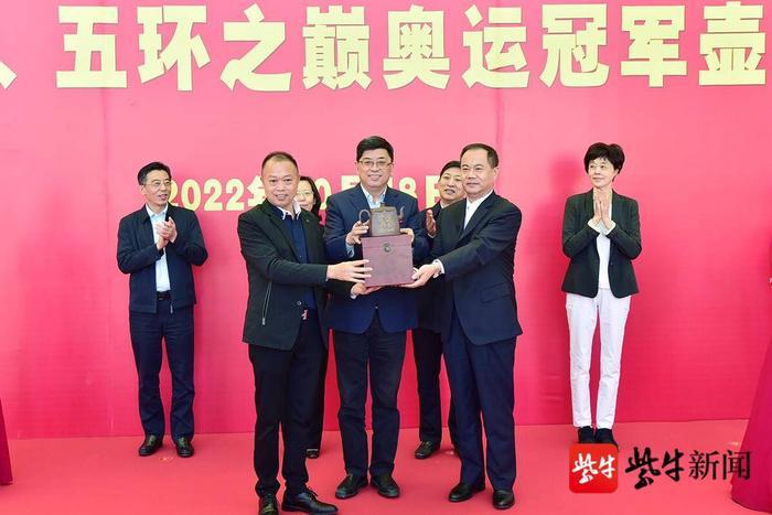 随后还举行了“五环之巅”奥运冠军壶赠送仪式,南京体育学院校长杨国庆代表南体接受了冠军壶。“五环之巅”奥运冠军精品紫砂壶由中国工艺美术师万碧海特制,壶身镌刻着南体16位奥运冠军的亲笔签名,以此纪念南体健儿的巅峰时刻,激励观者勇攀高峰、为国争光。中国书法院院长管峻、著名画家陈玺光向南体赠送了奥运冠军画卷,朱传耿代表南体接受了画卷。画卷主体由陈玺光潜心数月创作完成,卷首题字由管峻书写,画卷描绘了南体16位奥运冠军奋力拼搏、为国争光的画面。