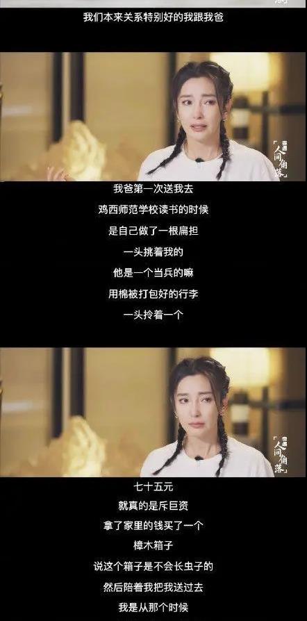 她还在节目中回忆父亲送她上学自己做扁担挑他的行李,怕有虫还斥巨资给她买樟木箱子的场景等等。