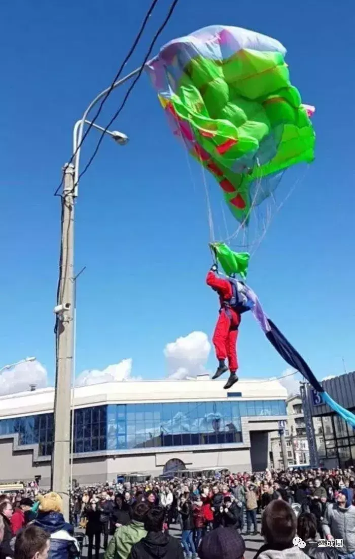 在跳伞后,被挂在电线杆上已经很尴尬了,再加上被一群人当成猴一样围观,估计这件事情会被这个跳伞人员记一辈子吧!