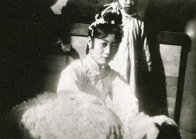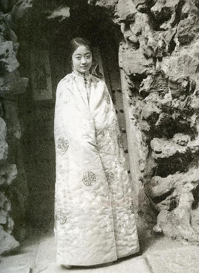 这张照片拍摄于婉容和溥仪大婚前一天,他们是在冬天结婚的,所以图中的婉容身披绣袍。