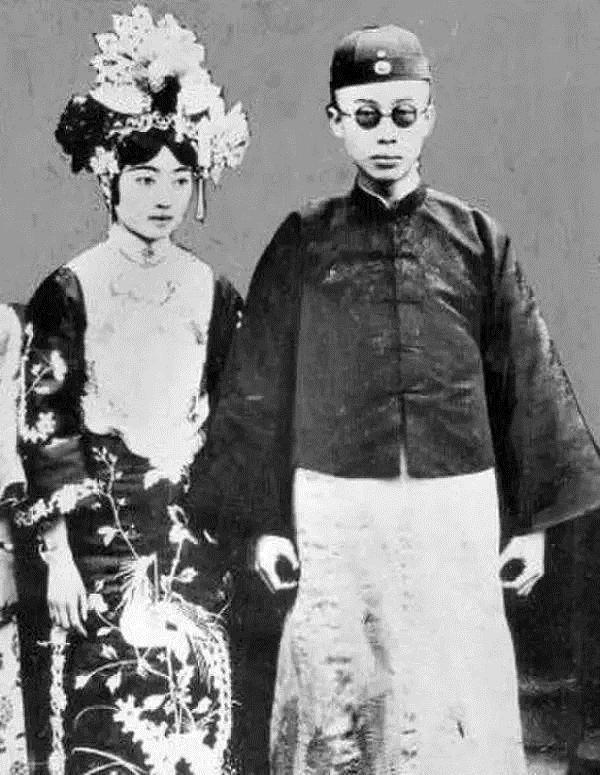 这是溥仪身着马褂,而婉容安静的站立在她身边,图中的二人还是十分般配的