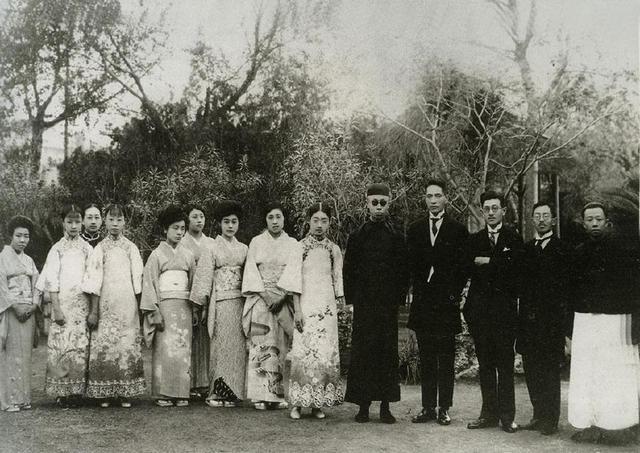 这是溥仪还有婉容更日本一些贵族的合影,在天津的溥仪当时一直寻求日方的帮助,图谋复辟,而日本也想要利用溥仪。溥仪是图中右五,婉容是右六。