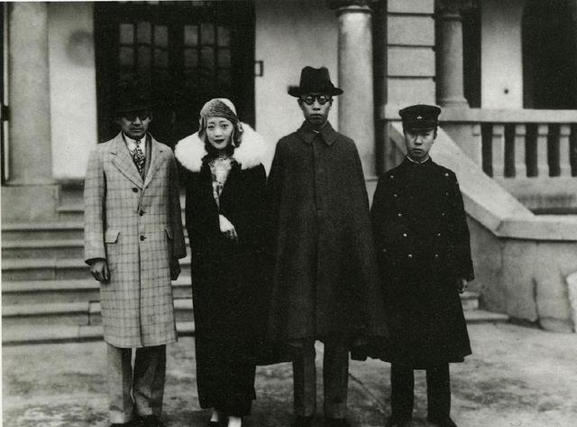 溥仪在日本人的扶持下,建立了伪满洲国,这是溥仪在成为满洲国皇帝后和婉容还有两位日本使臣的合影。婉容身披貂绒,带着头巾,十分时髦。