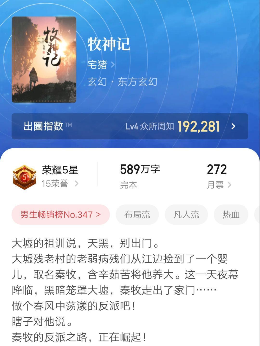 该书讲述了人族逆袭的蛮荒传奇故事,是人族崛起流的经典名作。“你看,祖星的风起了,吹动了伏羲的旗帜。”就是这本书的经典语句之一。
