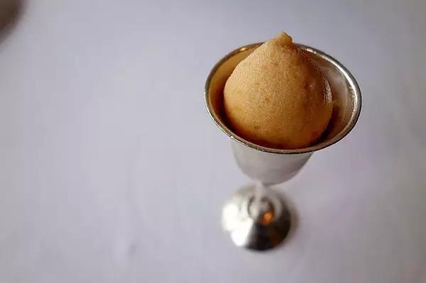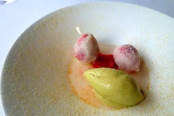 甜点是开心果雪糕配草莓。侍者还往里面倒了一些香槟。