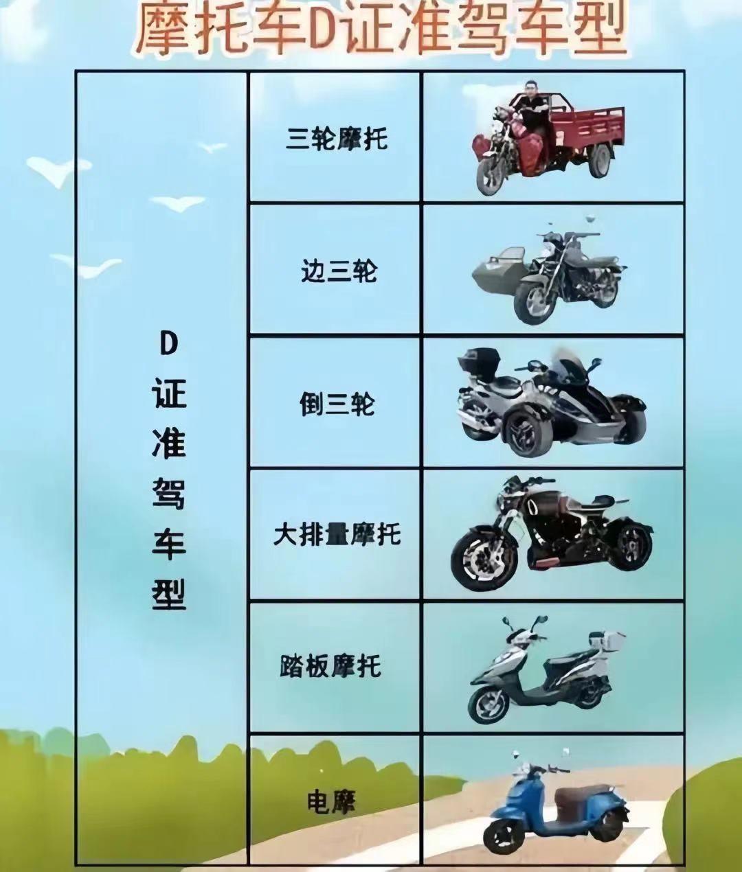 D证是三轮摩托车驾照里最高级别的,可以驾驶E、 F证的任意车型,持有D驾照可以驾驶两轮摩托和两轮轻便摩托车、两轮电动摩托和两轮电动轻便摩托车、电动三轮车、燃油驱动的倒、正和边三轮8种车型。