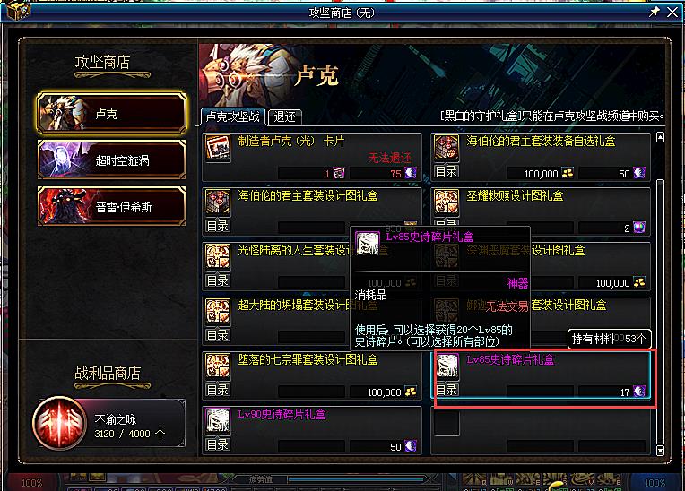 在卢克团本的攻坚商店中,可以用材料[魔岩石]17个兑换85级史诗任意部位碎片20个,且不限兑换次数。