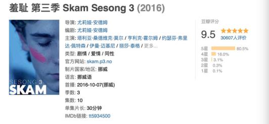 《SKAM》在中国有多火?其第三季豆瓣评分一度站上9.6,最终以9.5荣登“2016豆瓣电视剧榜其他地区最佳”,而这个分数其实就算放到欧美电视剧榜中依然不错。