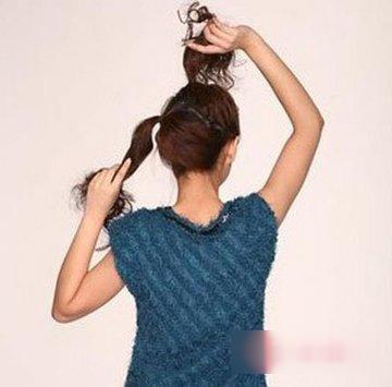 第二步:将上面的马尾辫在左上角盘成蓬松的丸子发髻,下层的马尾辫向上拉,和上层的发丝汇合在一起。