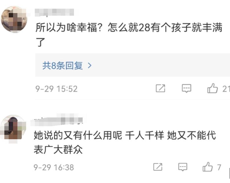 有人质疑孙怡的观点,认为她在小题大做,早婚有孩子未必就一定圆满;有网友认为孙怡完全就是在自我炫耀,她的生活并不能代表广大百姓。