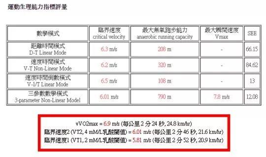 跑步运动生理能力的评量结果,如下图所示。以接近Brigid Kosgei破世界纪录成绩的2小时14分06秒预测,运动生理能力的vVO2max = 6.15 m/s (每公里2分42秒)、临界速度2 (VT2、4 mM/L乳酸阈值) = 5.36 m/s (每公里3分6秒)、临界速度1 (VT1、2 mM/L乳酸阈值) = 5.14 m/s (每公里3分14秒)。这个分析结果与Brigid Kosgei在破世界纪录成绩,各分段数据平均速度的最快3分06秒、最慢3分14秒的实际记录结果一致。