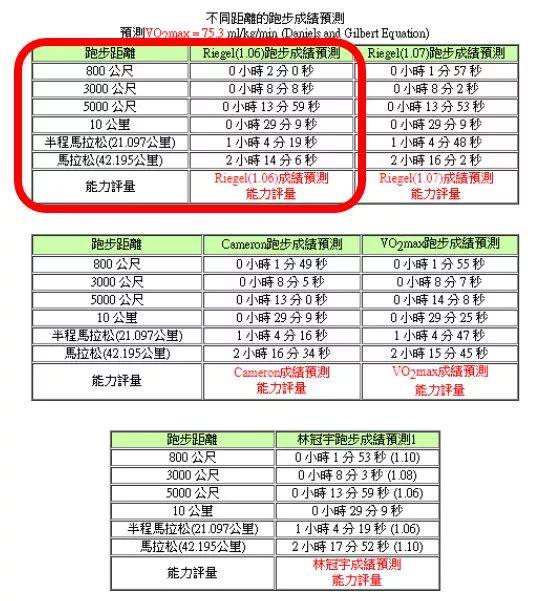 运动生理学网站提供了一个马拉松配速计算程序(www.epsport.net/epsport/program/run_test.asp),进行跑者跑步运动生理能力的评量,让已经经过长期训练的跑步选手,可以依据个人在800m、3000m、5000m、或者10000m的成绩,进行跑步运动生理能力的评量,进而依据运动生理能力的分析结果,进行马拉松比赛的配速选择。以Brigid Kosgei破世界纪录的2小时14分04秒为例,输入10000公尺跑步成绩29分9秒数据,可以获得下图五种跑步成绩预测的数据数据 (Riegel(1.06)预测、Riegel(1.07)预测、Cameron预测、VO2max预测、林冠宇预测),其中以Riegel(1.06)预测的结果2小时14分06秒最接近新世界纪录。按下「Riegel(1.06)成绩预测能力评量」的连结,即可进行跑步运动生理能力的评量。