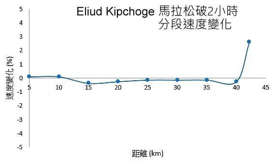 依据不同阶段的分段配速来看,Eliud Kipchoge每5公里的时间分别为14分10秒、14分10秒、14分14秒、14分13秒、14分12秒、14分12秒、14分12秒、14分13秒,最后的2.195公里时间则为6分4秒,换算每公里的跑步配速分别为2分50秒、2分50秒、2分51秒、2分51秒、2分50秒、2分50秒、2分50秒、2分50秒、2分46秒。上图呈现Eliud Kipchoge破2小时的不同距离速度变化数据,在运动科学团队与配速员的协助下,活动过程有相当稳定的跑步配速,40公里之后的跑步速度飞快,创造了人类的历史。