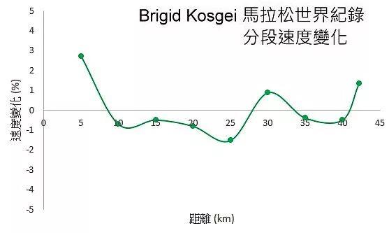 依据芝加哥马拉松网站的资料,Brigid Kosgei不同阶段的分段配速,每5公里的时间分别为15分28秒、16分00秒、15分58秒、16分01秒、16分08秒、15分45秒、15分57秒、15分58秒,最后的2.195公里时间则为6分53秒,换算每公里的跑步配速分别为3分06秒、3分12秒、3分12秒、3分12秒、3分14秒、3分09秒、3分11秒、3分12秒、3分08秒。上图呈现Brigid Kosgei破世界纪录的不同距离速度变化数据,与一般优秀选手选定的配速策略相当一致,不过在后半段有越跑越快的趋势,可能也是破世界纪录的原因。