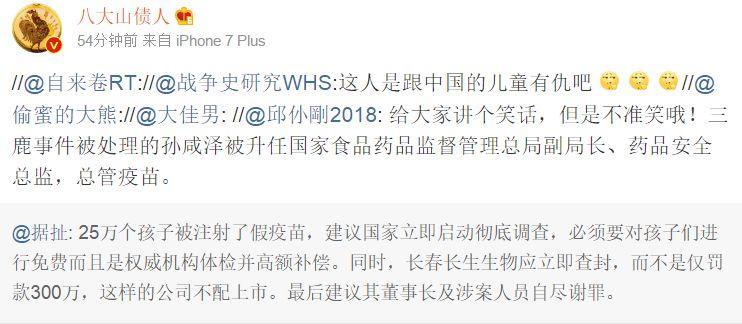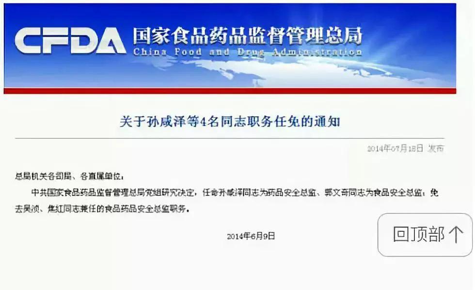 有网友扒出,当年三聚氰胺事件被免责的孙咸泽,2014年6月被任命为国家食品药品监督管理总局党组成员、药品安全总监。