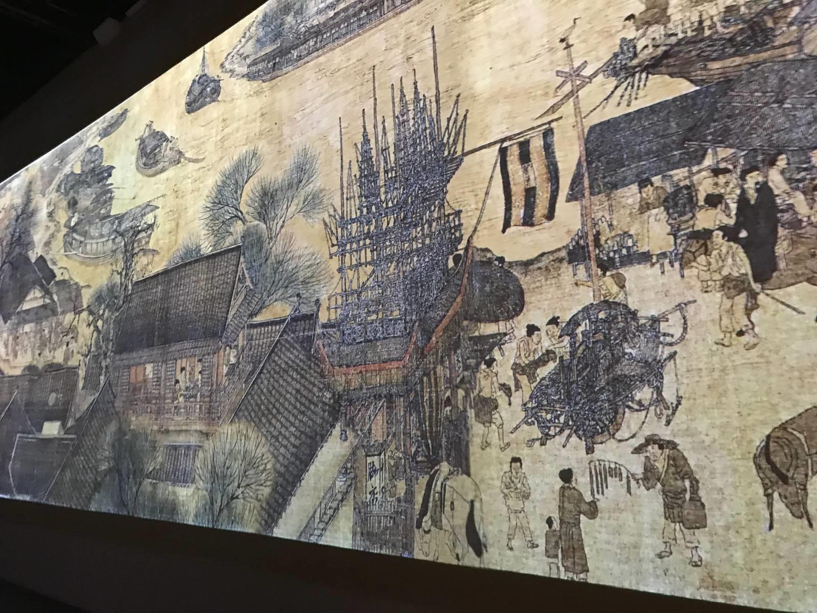 出了箭亭,往前走在广场上有故宫的商店,可以在里面吃饭,补充一下体力。在故宫商店的正对面举办了《清明上河图3.0》高科技互动艺术展,展馆内有《清明上河图》巨幅互动长卷、孙羊店沉浸剧场、虹桥球幕影院三个展厅,以及一个北宋人文空间。通过8K超高清数字互动技术、4D动感影像等多种高科技互动艺术,构筑出真人与虚拟交织、人在画中的沉浸体验。