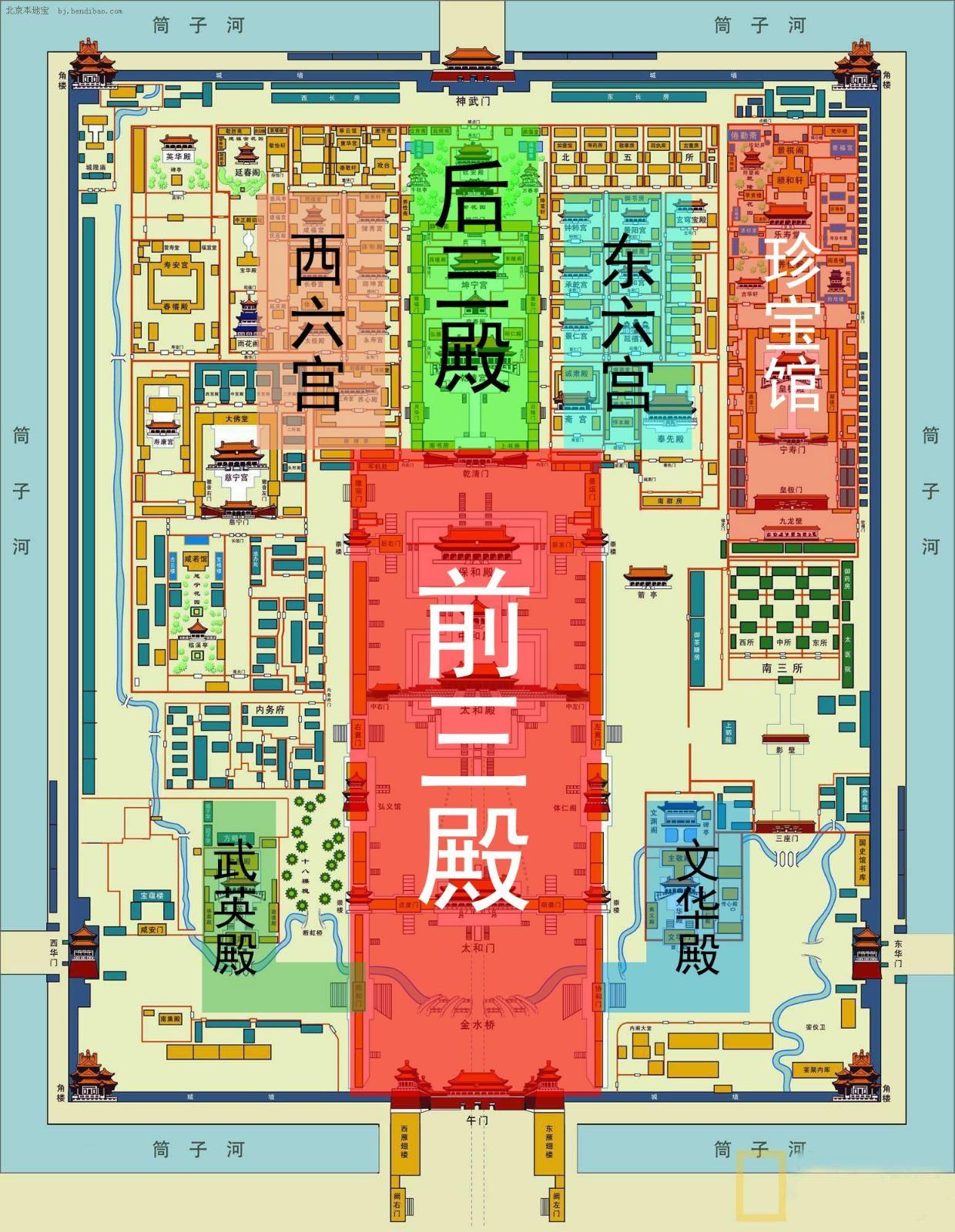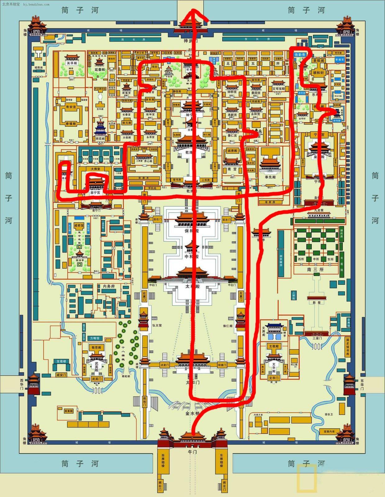 故宫有不走回头路的说法。因为故宫的面积太大,再加上很多的宫殿没有开放,我便为大家推荐一条我心目中比较好的游览路线,既能看到绝大多数故宫的珍品,又能在尽可能短的时间里游览完故宫主要的几大殿。