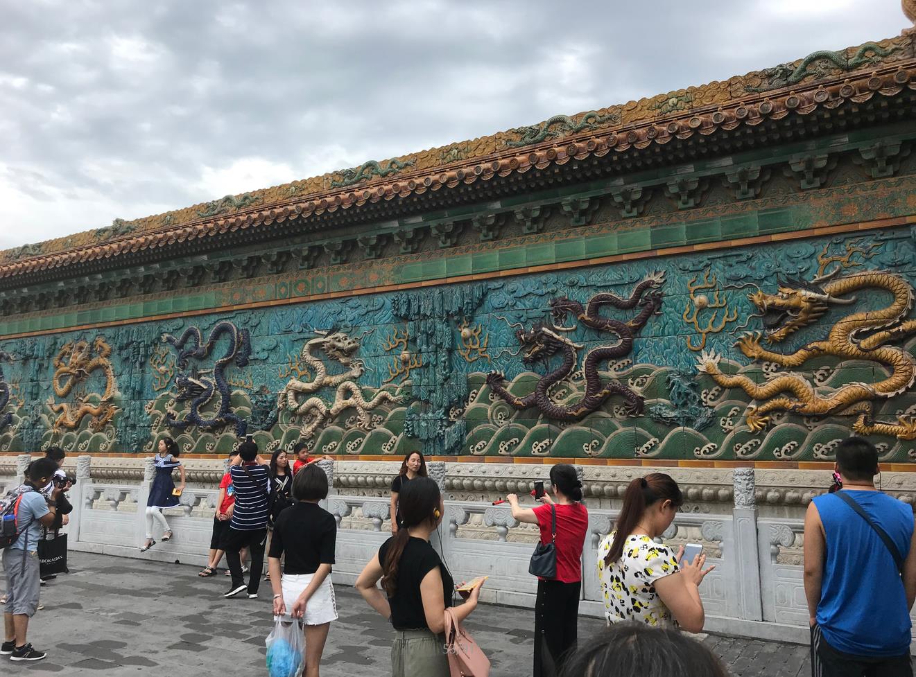 参观珍宝馆是需要门票的,里面有很多故宫的珍品非常值得一去。首先进入锡庆门,映入眼帘的就是著名的九龙壁,整个壁长29米多,为单面琉璃影壁。影壁上缠绕着九条龙,背景为蓝色和绿色的云水,整体气势磅礴,色彩鲜明,庄严端庄,引人注目。正中是黄色的龙,瞠目张颔,威武雄伟。左右则是白龙和蓝龙两条,最外一侧是黄龙和紫龙。