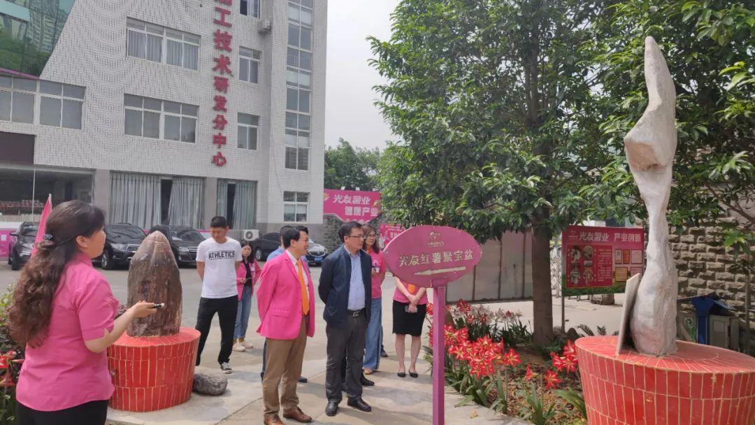 在光友薯业董事长邹光友的陪同下,校领导们参观世界首座“光友红薯博物园”。在雕塑园区,校领导们饶有兴致地,听光友导游介绍天然硅化木“光友红薯弹”、“古生物化石”、“光友苗条粉丝美女”等奇观,雕塑园中心重达10吨玉雕“红薯聚宝盆”,让校领导们大饱眼福。
