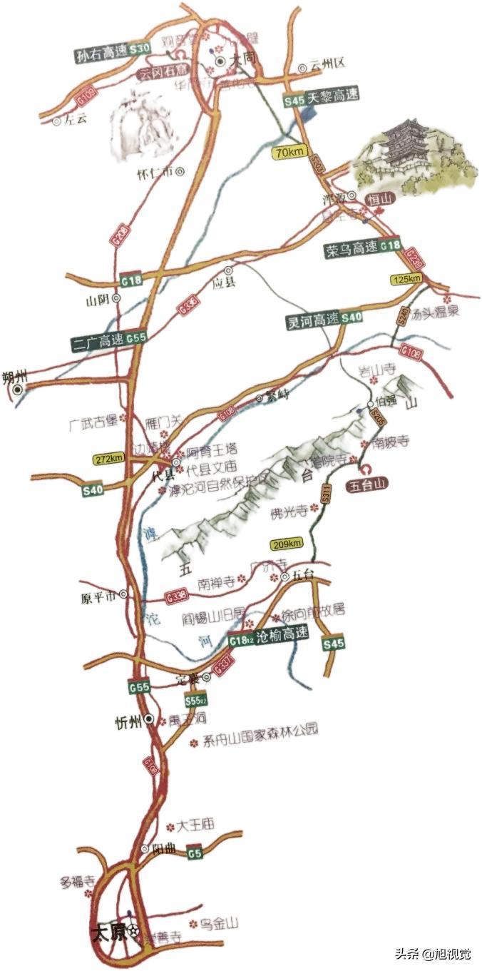 路线说明:本路线全程676公里,用时4天。本路线主要观看要点是攀登五岳之一的恒山和参观道教圣地悬空寺,观看五台山上各有千秋的寺庙,学习博大精深的佛学知识 (因人而异,我想大部分人还是感叹寺庙之多,特色之不同)。这条路线可谓是道教与佛教的盛宴,懂的人可好好体会,不懂的权当旅游,增长知识。当然景色少不了,例如:
