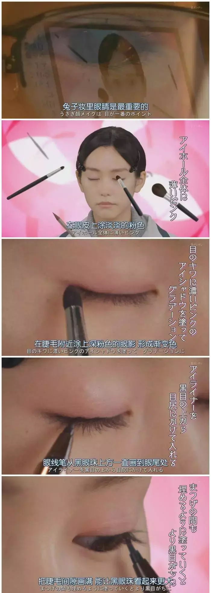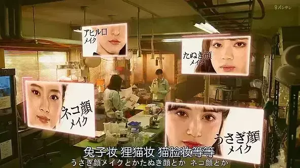 比如第一集就从日本当下最流行的一堆妆容中选中了具有压倒性人气的“兔子妆”,理由是“因为有种让人放心不下,无法置之不理的感觉”,这种楚楚可怜的撩男小心机也是非常小女生了。根据教程,兔子妆的关键是皮肤,粉色系的隔离霜弹走暗沉,涂上比自己皮肤白皙的粉底液,再打上一层无色的散粉,让肌肤变的柔软像兔子一样。而兔子妆的眼影、腮红、唇膏都是粉色系的可爱风。如同美妆教程一样,每一步都有对应的画面和操作,虽然最终女主们尝试失败,但是看下来也是收获不小。