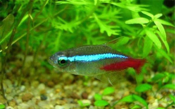 红绿灯鱼体型娇小,全长3~4厘米,鳍也不大。体色突出在侧线上方有一条霓虹纵带,从眼部直至尾柄前,在光线折射下既绿又蓝,尾柄处鲜红色,游动时红绿闪烁。养几十尾红绿灯鱼,如观焰火。背鳍位于背中部,臀鳍较延长至尾柄后方,各鳍均透明。红绿灯鱼喜欢22~24℃水温,弱酸性,PH6.4~6.8,硬度4~8度软水的老水。故在饲养中要少换水,换水量亦宜少,环境安静,不要强光照射。对饵料不苛求,鱼虫、水蚯蚓、干饲料都肯摄食。红绿灯鱼喜欢集体活动,育几十尾一群,它们将整日欢快泳游。