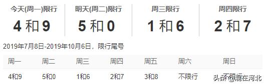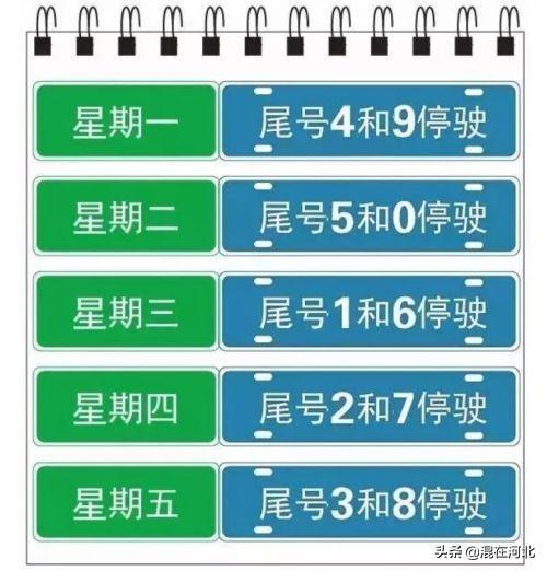 2019年9月24日起,每日7时至20时(不含节假日)。限行号牌规则与京、津保持一致,星期一至星期五(每日7时至20时)限行机动车号牌尾号分别为:4和9、5和0、1和6、2和7、3和8,尾号为英文字母的以最后一位数字为准。解除或限行号牌规则变化另行通知。