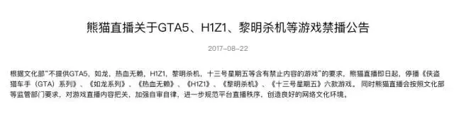 《关于GTA5、H1Z1、黎明杀机等游戏禁播公告》