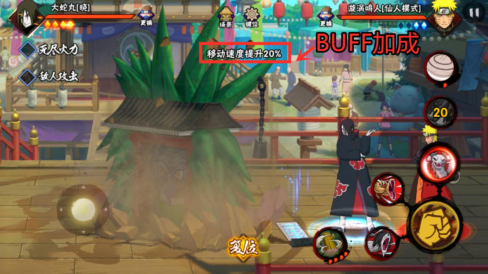 在介绍这个忍者之前,我们先熟悉大蛇丸的专属秘卷!和柱间的一字连柱相似,大蛇丸使用土流枪时,会替换成三重罗生门!(严格意义上来说,是单重罗生门)。根据单局土流枪的使用次数,大蛇丸会使用不同类型的罗生门,并且给自身加上BUFF。第一次使用是拥有百分之50的减伤,第二次就如上图所示,增加移动速度百分之20,第三次的话小编经过测试会减少替身术5秒的冷却CD!