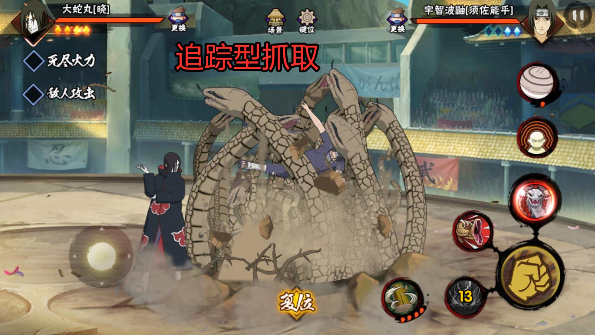 我们的大蛇丸在第一形态下,普攻最后一段就拥有抓取效果!因而,很多玩家习惯处于第一形态,每当连击对手时,抓取能力让普攻变得尤其稳定!而且玩家们要知道,抓取伤害是不计入保护中的,大蛇丸使用第一形态普攻,可以将对手连在空中好久哦!