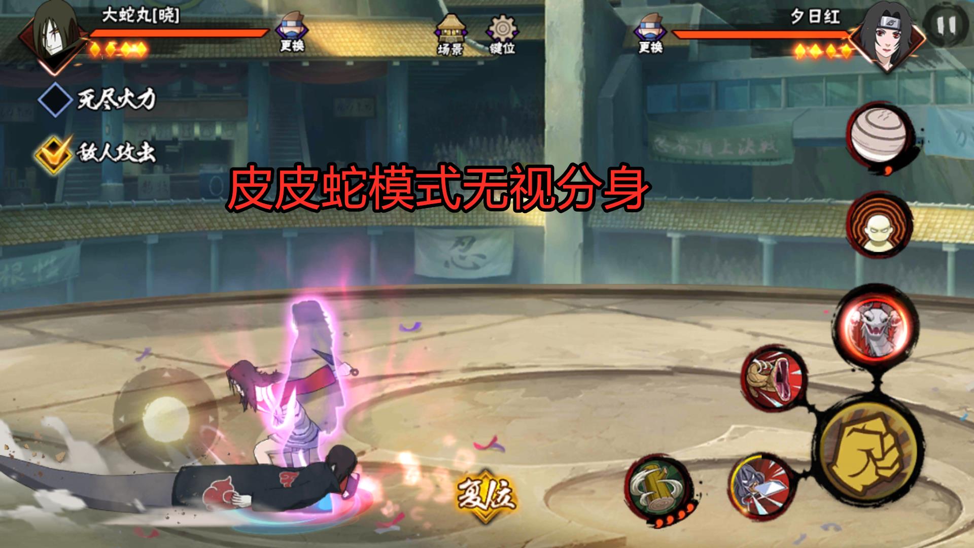 大蛇丸转化到第二形态,皮皮蛇模式后!短按一技能会有长达4秒的蠕动模式!没错,就是像蛇一样蠕动,确切意义上说,这是一个遁地技能!老玩家都知道,遁地技能可以穿过很多的障碍物!只要对方的飞行道具没有扫地能力,大蛇丸就可一路畅行无阻!像红,晓鼬和白绝的分身以及须佐鼬的勾玉等,我们的大蛇丸都可以躲过去!