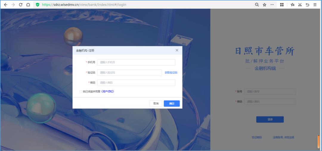 5、金融机构在日照市车管所线上抵解押业务平台完成资质认证和相关备案后,点击登录按钮即可进入在线办理抵押解押业务系统办理业务。