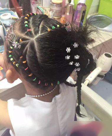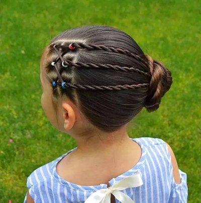 小女孩的梳盘发打造,五颜六色的皮筋梳扎出了潮流时尚,勾勒出的线条看上去更加迷人漂亮,打毛的头发应和了孩子的可爱乖巧,非常棒的女童发型设计。
