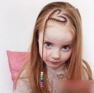 三岁女童头发已经长到肩部下面了,不过发量不是很多,妈妈给小女孩编辫子的时候,不要一直将女孩的头发都编起来,头顶靠前的发丝编织成细密辫子,在头顶上形成心形,剩余的发尾编成细细的辫子,尾端穿上彩色小珠子,一款新颖精致的女童编子发型就成了。